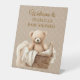 This adorable acrylic sign will greet your guests and start the excitement of your baby shower. A sweet teddy bear is sitting in a wicker basket filled with cozy blankets. A light tan lattice work covers the background. There's an easy to use template for you to put the Mom to Be's name in place of the example shown.