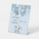 Tarjetas y señas de regalo para una ducha de bebé, celebrando a un bebé Decorado con globos azules, goteos falsos de purpurina, pinturas con goteo, purpurina, tiras de fiesta y un lindo elefante bebé. Fondo azul claro. El texto: Tarjetas y regalos - ¡gracias!