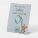 Bienvenido a sus huéspedes con encanto y dulzura usando este adorable signo de bienvenida de una ducha bebé. Con un oso de peluche tierno sosteniendo un globo azul rodeado de suave vegetación eucalipto, este cartel complementa perfectamente tu "Oh Boy! Podemos esperar temprano". Una hermosa manera de marcar el tono de tu celebración, este letrero es ideal para colocarlo en la entrada, mesa de regalo o área de fotos.