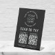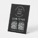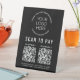 Simple cartel negro de pedestal para mesa para tu negocio con 2 códigos QR para que los clientes los escaneen para realizar pagos, lo que te permite recibir pagos en cualquier momento y lugar. Sube tu logotipo y códigos QR, y agrega el nombre de tu empresa, número de teléfono y dirección o otra información en tipografía blanca simple.