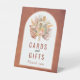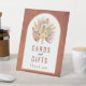 Hojas de palma secas tropicales, pasto pampas y flores de protea barro arco de terracota y regalos boda Rótulo Pedestal. Este bonito diseño boda presenta un marco de arco sobre fondo de terracota. En el marco está tu texto, un ramo de hojas de palma secas, flores de protea y pasto de pampas.