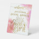 Estas modernas y elegantes señales de pedestal "Brindis por el amor" para la fiesta de la novia presentan una copa de vino minimalista y una tipografía de escritura caligráfica moderna y elegante, para un diseño encantador y con estilo que te encantará, sobre un fondo blanco aireado y chic.