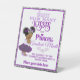 Princesa afroamericana con adorables colas de ponis afro con lavanda y tutu morado oscuro con un adorno de rosa blanca; anillo de diamantes y tiara de diamante en un fondo blanco. Ideal para una ducha de bebé con temática de princesa púrpura o para una fiesta de cumpleaños. Todo el texto es Personalizable. ©2023 Señales de Miss Fiesta Sassy