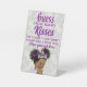 Princesa Afroamericana con adorables cócteles afro con tatuajes morados oscuros con un adorno de rosa blanca; canto de diamantes y tiara de diamante sobre un fondo floral de clavel blanco. Ideal para una ducha de bebé con temática de princesa púrpura o para una fiesta de cumpleaños. Todo el texto es Personalizable. ©2022 Señales de Miss Fiesta Sassy