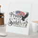 A bold patriotic design featuring distressed typography, camouflage lettering, military dog tags, and a dynamic United States flag with eagle detail. "Proud Mom of a Soldier" stands out with strong military pride and emotional strength, while "Strength Wears Love" adds heartfelt meaning. Ideal for military family themes, patriotic style, and proud army mom expression with a powerful vintage-inspired look.