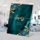 Un letrero elegante y sofisticado para dar la bienvenida a los invitados de la boda a la mesa de regalos. La palabra "regalos" aparece en caligrafía dorada, con la invitación "por favor tome uno" debajo en letra serif. El fondo presenta ramos florales en azul verde adornados con follaje dorado en dos esquinas, sobre una imagen de fondo de ágata de acuarela en verde azulado. Vea nuestra colección para obtener un conjunto de invitaciones de boda y papelería correspondiente.