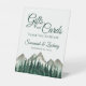 Este cartel de bonito es perfecto para que sus huéspedes bodas sepan dónde dejar sus regalos y tarjetas. Presenta un diseño rústico y elegante de acuarela, con una cordillera alpina y pinares verdes en el primer plano. El cartel dice: Regalos y tarjetas, ¡Muchas gracias! Hay sitio para sus nombres y la fecha del boda a continuación.