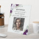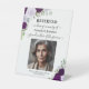 Esta hermosa señal boda es una maravillosa manera de recordar y reconocer a un ser querido que ha fallecido y está viendo la ceremonia desde el cielo. El cartel muestra una foto de tu ser querido con la frase Reservado en la memoria amorosa de con su nombre y relación con la pareja. Las obras de arte incluyen rosas acuáticos pintados a mano en tonos violeta, lavanda y ciruela, además de brotes de hojas de eucalipto y vegetación.