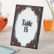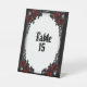 Hermosas rosas rojas profundas sobre hierro forjado enmarcan un número de mesa. Forma parte de una suite boda llamada Red Rose Gothic. Es fácil coordinar todo para tu boda una vez que elijas la temática y los colores correctos. Elija un diseño temático boda único para hacer su día especial perfecto. El Fancy House cuenta con una gran variedad de suites bodas, temáticas y de colores variados. Por favor, compruebe tres veces su texto antes de la compra final