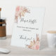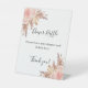 Una señal de rifa de pañales. Un fondo blanco. Decorada con oro rosa, flores rosadas y pasto pampas.