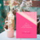 tiene un patrón geométrico de rosas con color rosa, coral y rojo con color rojo complementario que se mezcla armoniosamente como uno. La tipografía inclinada crea un estilo único con la franja rosa de coral que resaltar.