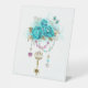 Llave de oro antiguo con rosas turquesa de moda decorados con hojas de oro blanco y cuentas rosas y azules. Color de moda. Rosas turquesas. Oro blanco. Tifanía azul.