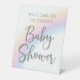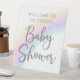 Un cartel de bienvenida con letras purpurinas plateadas en un arcoiris pastel bonito y un fondo de color. Este signo de bienvenida de ducha de bebé arco iris se personaliza fácilmente para tu evento simplemente añadiendo tus detalles.