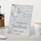 Elegante cartel de la mesa de bodas con una linterna iluminada con velas en brillante nieve. A pesar de estar colocado como un cartel para invitar a familiares y amigos a firmar el libro de visitas, también puedes personalizar este símbolo de pedestal para otros propósitos. Hermoso para un Navidad o una boda de invierno.