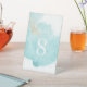 Un signo de número de la mesa acuosa de color turquesa con acentos dorados.