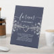 Elegante y sencillo boda azul marino seña de mesa en la mesa con el corazón de la cuerda de plata y encaje floral vintage dorado.
