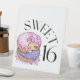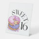 Este letrero peatonal muestra las palabras "Sweet 16" en una letra única impresa con letras negras con dounts rellenando y rociando en este dulce tema y estilo de 16 años. Impreso con impresión digital de alta calidad y a todo color disponible en 4 tamaños de pantalla de 1/16" de poliestireno de plástico blanco de 10" x 12" con base de 3".