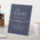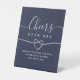 Elegante, moderno y simple caligrafía boda azul marino Open Bar señal de mesa con corazón de cuerda plateada.