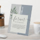 Elegante, moderno, sencillo, botánico, boda azul polvoriento símbolo de la mesa Memorial, con iniciales gigantes en monograma y verde acuarela.