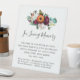 Una señal conmemorativa del boda que se puede colocar en una pantalla de mesa. Plantilla de signo rústica y elegante. Cuenta con un elegante ramo de flores borgoñas, rosas naranjas y blancas en la parte superior. Esto lo hace perfecto para una boda otoño. In Loving Memory está escrito en un tipo de letra moderno y de moda que es muy popular. Hay una cuidadosa declaración conmemorativa y luego se puede listar al difunto. Esto forma parte de la colección Sunflower and Burgundy boda que tiene muchos componentes.