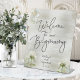 Un cartel de Bienvenida a nuestro Comienzo que presenta un estiloso, moderno y sincero guión escrito a mano que parece como si escribieras el letrero tú mismo, con un suave sabio etéreo verde y fondo dorado con suculentos pintados de acuarela y peonías blancas, incluyendo dos peones a punto de abrirse; lo que podría ser más alentador y romántico.