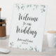 Acuarela eucalipto verde en verde salvia en la parte superior e inferior, con un guión de caligrafía de tipo de cambio cursivo que le da la bienvenida a su boda con sus nombres y fecha de boda numérica.