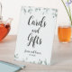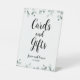 Acuarela eucalipto verde en verde salvia en la parte superior e inferior, con un guión de caligrafía de tipo de letra cursivo que permite a los invitados saber dónde colocar sus tarjetas y regalos, con sus nombres y fecha de boda numérica.