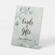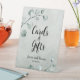 Un elegante y sofisticado cartel boda de tarjetas y regalos con eucalipto verde salvia pintado de color agua contra un fondo oscuro verde sedoso, con un animado guión de caligrafía cursiva que aconseja a los huéspedes dónde colocar sus tarjetas y regalos con sus nombres y fecha de boda numérica.