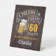 Elegantes vítores y cervezas a 60 años diseño tipográfico sobre fondo de grano de madera marrón, personalizado con tu propio texto, divertido y único, ideal para cualquier fiesta de cumpleaños adulto para hombres, o fiesta de aniversario para cualquier ocasión.