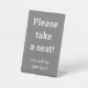 Este respetable diseño incluye el mensaje "¡Por favor, siéntese!", junto con el mensaje "Volveremos enseguida". Esto podría utilizarse en una zona de estar para informar a los clientes o visitantes de que recibirán asistencia en breve, y que deberán ocupar un asiento hasta entonces.