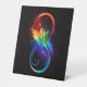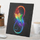 Símbolo de infinito dibujado artísticamente con una hermosa pluma arco iris sobre fondo blanco. Estilo tatuaje.