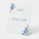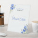 Elegant Blue Iris dessert table sign displayed on a plastic pedestal, designed for a Something Blue Before I Do bridal shower. Featuring soft blue floral artwork, this sturdy freestanding sign is perfect for highlighting the dessert or sweets table. Coordinates beautifully with matching welcome signs, guest book signs, bar signs, games, napkins, plates, and other blue iris bridal shower décor.