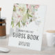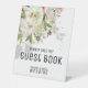 Un moderno y elegante ramo floral de color rosa y blanco, con su sombra que se derrama suavemente en este cartel de la mesa del Please Rótulo Our Guest Book (Por favor, nuestro libro de invitados) con salpicaduras y elementos dorados brillantes, con sus nombres y citas debajo de una letra moderna.