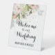 Un moderno y elegante ramo floral de color rosa y blanco, con su sombra que se derrama suavemente en este cartel de la mesa de Bienvenidos a nuestro Boda, que presenta salpicaduras y elementos dorados brillantes, con sus nombres y citas debajo de una fuente moderna.