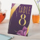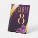 Larger than the standard 3 by 5 inch table cards, our pedestal style table numbers are available in various taller sizes, allowing you to adjust the size to fit your seating arrangement perfectly. The graceful calligraphy script and the striking contrast between the rich purple and the golden elements make these table numbers a stunning addition to your reception tables.
