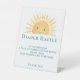 Este Rótulo Baby Shower Diaper Raffle Pedestal cuenta con un sol sonriente de color amarillo y tipografía azul. Acuarela original © Michele Davies.