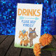 Zorro de madera azul y Rótulo peatonal de mesa de cerveza. En azul, Naranja, Brown. Animales forestales (Fox y ciervo). Recorrido de una colección silvestre por impresiones de papel de píxeles