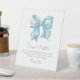 Este encantador cartel de mesa presenta una suave proa de color azul en la parte superior. El cartel anima a los invitados a dejar su paquete de pañales para la futura madre y a entrar en la rifa dejando sus boletos del correo de invitación. El diseño es sencillo y clásico con texto gris en una mezcla de serif y tipografía de guiones. La parte posterior tiene un fondo azul claro y se pueden personalizar los colores para que coincidan con el tema. Este elegante cartel le da un toque de atención a su ducha de bebé y funciona perfectamente todo el año. Tipografía De Guión Dulce Elegante Bow Azul Tema Baby Shower Tabletop Diaper Raffle Rótulo.