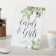 Guíe a sus invitados con elegancia con este letrero de pedestal de boda "Tarjetas y regalos", adornado con suaves elementos botánicos verdes y letra clásica. Una forma elegante de mostrar gratitud mientras se mantiene el tema. Totalmente editable para su día especial.