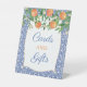 Naranjas acuarelas y flores de bonito sobre un fondo de azulejos cobálticos azules y blancos para este elegante signo/decoración de Ducha o Cumpleaños