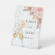 Para una despedida de soltera. Un fondo blanco, flores rosadas y hierba pampas. Burbujas y un par de copas. Texto: Tarjetas y regalos. ¡Gracias!