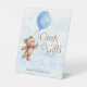 Tarjetas y regalos Rótulo Baby Shower Teddy Bear. Un lindo oso de peluche acuarela sostiene un globo azul. Banner de puntos de la acuarela azul polka con fondo de cielo. "Tarjetas y regalos" se muestra en una tipografía escrita a mano. Tiene la opción de cambiar la redacción en la parte inferior. ©Kimbellishe, LLC