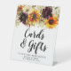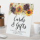 Las hermosas flores crean una impresionante tarjeta de despedida de soltera y una señal de mesa de regalos que puede sostenerse por sí sola. Una combinación hermosa de rosas rojas oscuras, girasoles amarillos dorados y hortensias blancas están anidadas en hojas de otoño. Mucho follaje con enredaderas y hojas surtidas lo convierten en un diseño floral muy moderno. Tiene un poco de un aire boho chic, debido al follaje colgante.