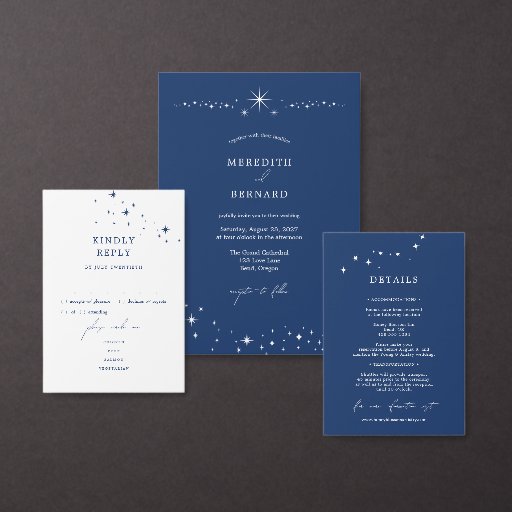 Invite a sus huéspedes a una noche de romance y luz de las estrellas con estas elegantes tarjetas celestiales de boda lunar y un cartel de regalo de la Colección Celestial Elegante de Bodas. Con un fondo marino profundo adornado con estrellas brillantes y una tipografía refinada, este moderno diseño celeste es perfecto para parejas que aman una estética minimalista pero lujosa. Fácilmente personalizable con sus nombres, fecha de boda y detalles del lugar para un toque totalmente personalizado. Ideal para bodas celestes, celebraciones de invierno o elegantes recepciones nocturnas. Póngalo en pareja con tarjetas RSVP, programas, menús y carteles para una suite boda cohesiva.