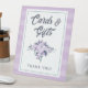 Cartel de señalización de mesa para Baby Shower de tarjetas y regalos florales lavanda púrpura y azul verde claro de luz violeta vintage: este diseño dulce y chic presenta un suave ramo floral de acuarela, una fuente de escritura retro linda, fondo a rayas con textura de acuarela y texto editable. Una paleta de colores encantadora para el baby shower de una niña. ¡Perfecto para la mesa de tarjetas y regalos para que los invitados sepan dónde colocar sus artículos!