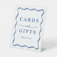Añada un toque elegante a su boda, ducha de novia, ducha de bebé, fiesta de graduación u otro evento especial con estas tarjetas Modern Blue Wavy Frame y un símbolo de regalo para peatones. El diseño incluye "Tarjetas y Regalos" con letras en negrita azules rodeadas de un borde ondulado azul que contrasta con el fondo blanco. Personalice el signo de las tarjetas retro y los regalos con el texto de su personalizado a continuación.