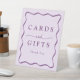 Añada un toque elegante a su boda, ducha de novia, ducha de bebé, fiesta de graduación u otro evento especial con estas tarjetas Modern Purple Wavy Frame y un símbolo peatonal de regalos. El diseño presenta "Tarjetas y Regalos" con letras violetas en negrita rodeadas de un borde violeta que contrasta con un fondo violeta claro. Personalice el signo de las tarjetas retro y los regalos con el texto de su personalizado a continuación.