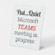 Preserve your meeting sanity with this attractive and straightforward message. Give others a heads up to be quiet, when they come into your space. Featuring a combination of script and modern typography, this pedestal sign gets straight to the point. Place where it can easily be seen and meet in peace!