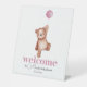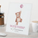 Un cartel de bienvenida a una ducha de bebé chica con un oso de peluche y un globo rosa. Elementos coincidentes disponibles en la colección Temática de Baby Shower de Teddy Bear.