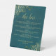 This tabletop sign is a great way to let your guests know the bar menu at your wedding reception. It features a simple yet elegant design with golden faux foil curls and swirls on a dark teal colored background. The title is written in gold script calligraphy and reads: The Bar. There is space for your drinks menu as well as the names of the couple and wedding date.